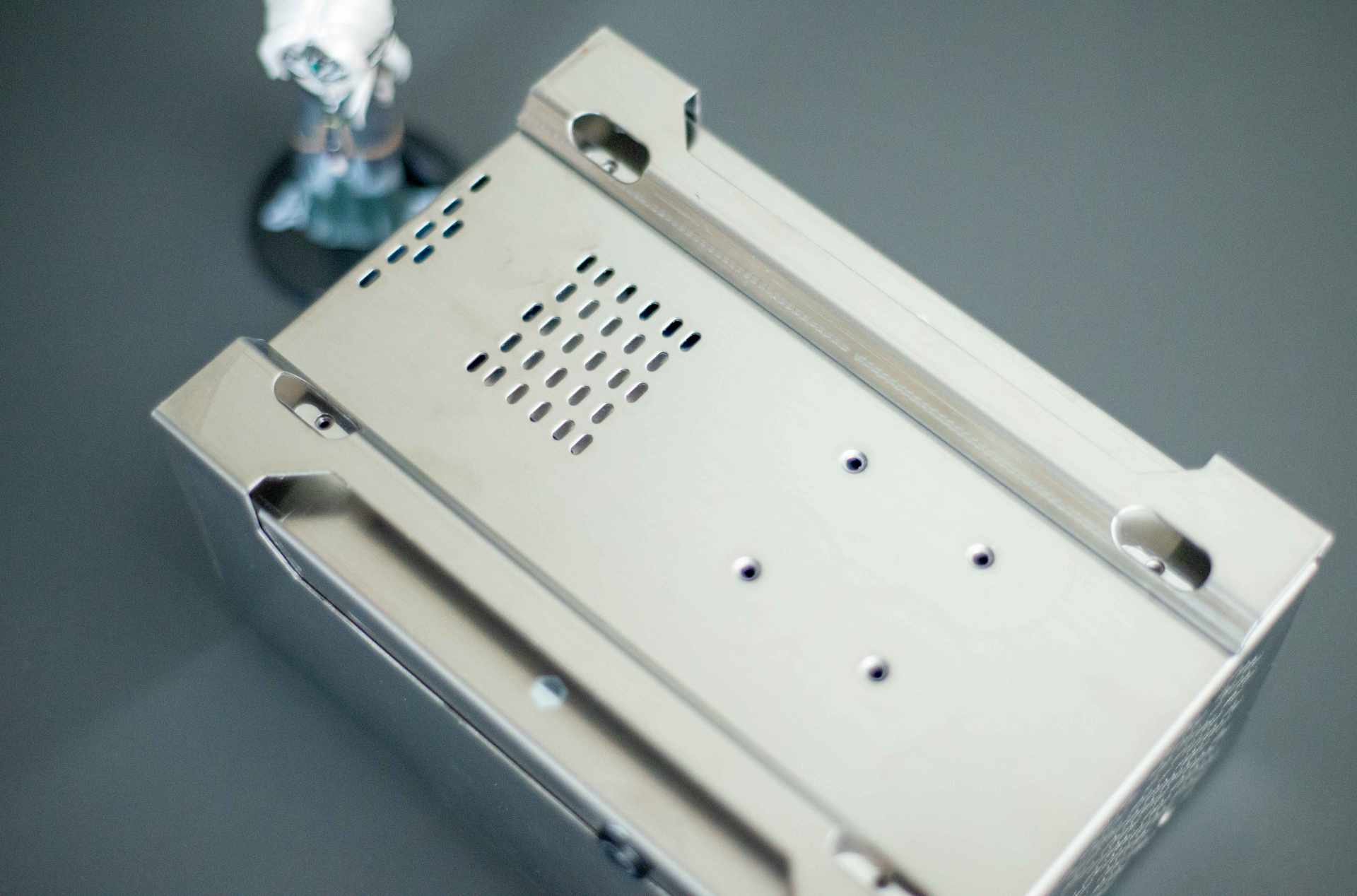 ▼撕掉白膜质感立马提升了一大截,不锈钢独有的工业气息扑面而来。在铝材机箱为主流的今天,不锈钢显得那么特立独行。机箱尺寸210X145X100mm,整体显得很小巧。找了一盒牛奶来进行对比。