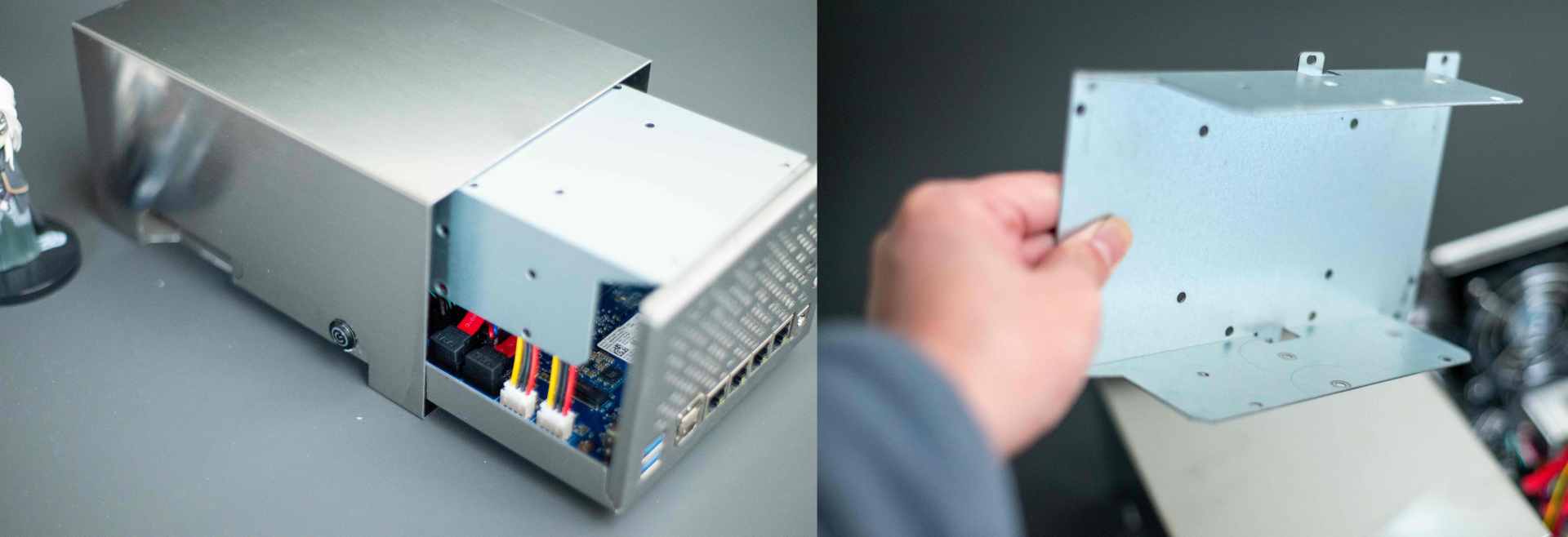 ▼上面这块钢板是固定硬盘用的,看得出来是直接弯折处理,原汁原味。支持两块3.5吋/2.5吋机械硬盘,不过没有快拆设计。