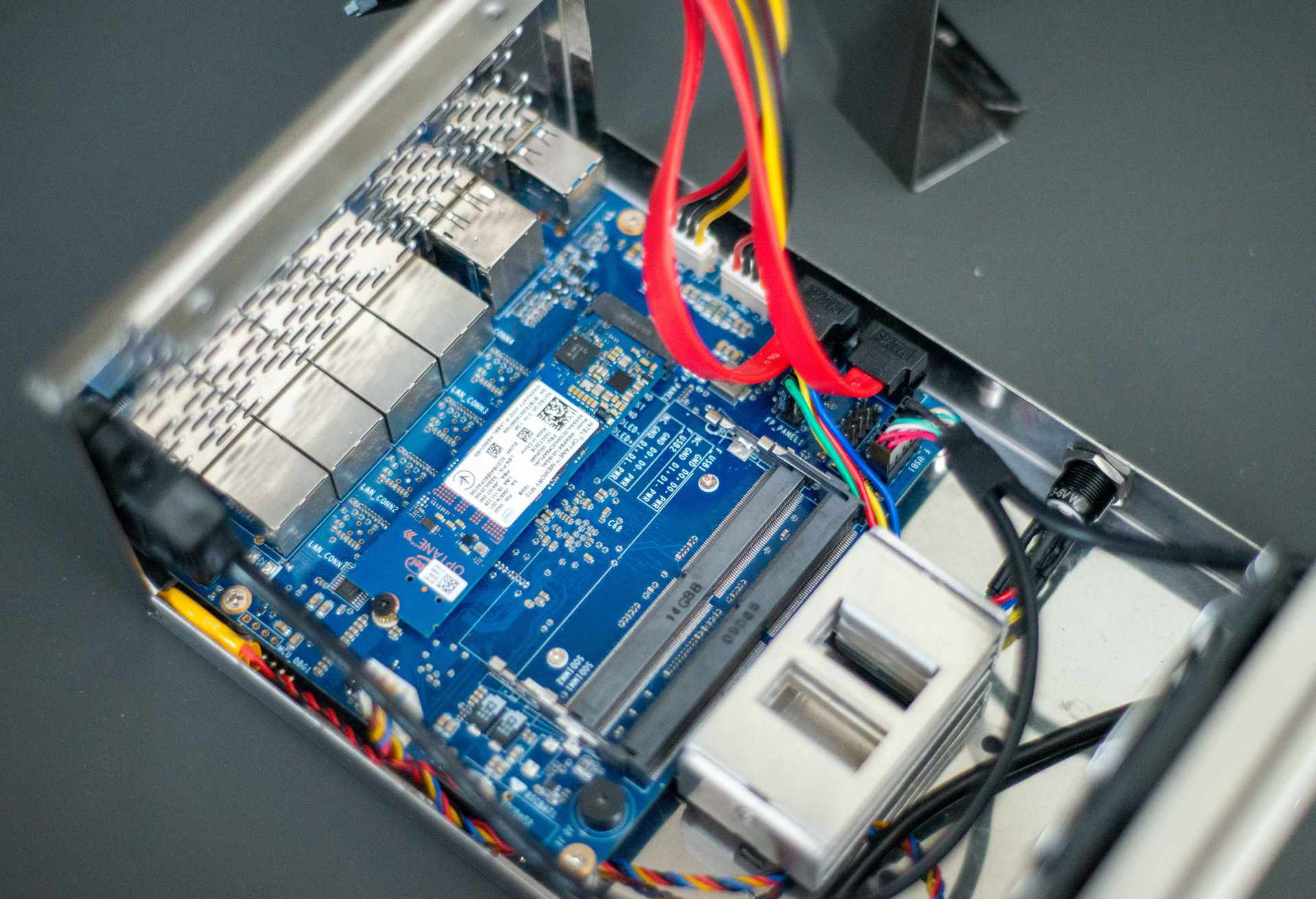 ▼机箱内部整体结构还是比较清爽,蓝色PCB板,板载J4125,标配一块intelNVME傲腾16G固态,这块盘上店家已经预装了四合一系统,到手即用。