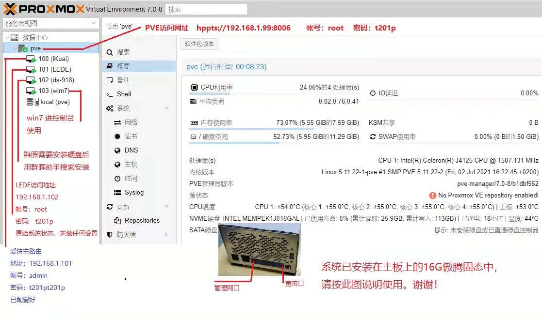 ▼开始还傻乎乎的接上了便携屏和键盘,结果发现直接就可以登录PVE的后台,根本用不上这些设备去BIOS里调节。店家连BIOS也已经设置好了的,完全是手把手把饭喂到了嘴边。不过既然接上了也别浪费,拍个照给大家展示一下,当你在屏幕上看到这个网址就说明PVE正常启动成功,可以进入后台了。