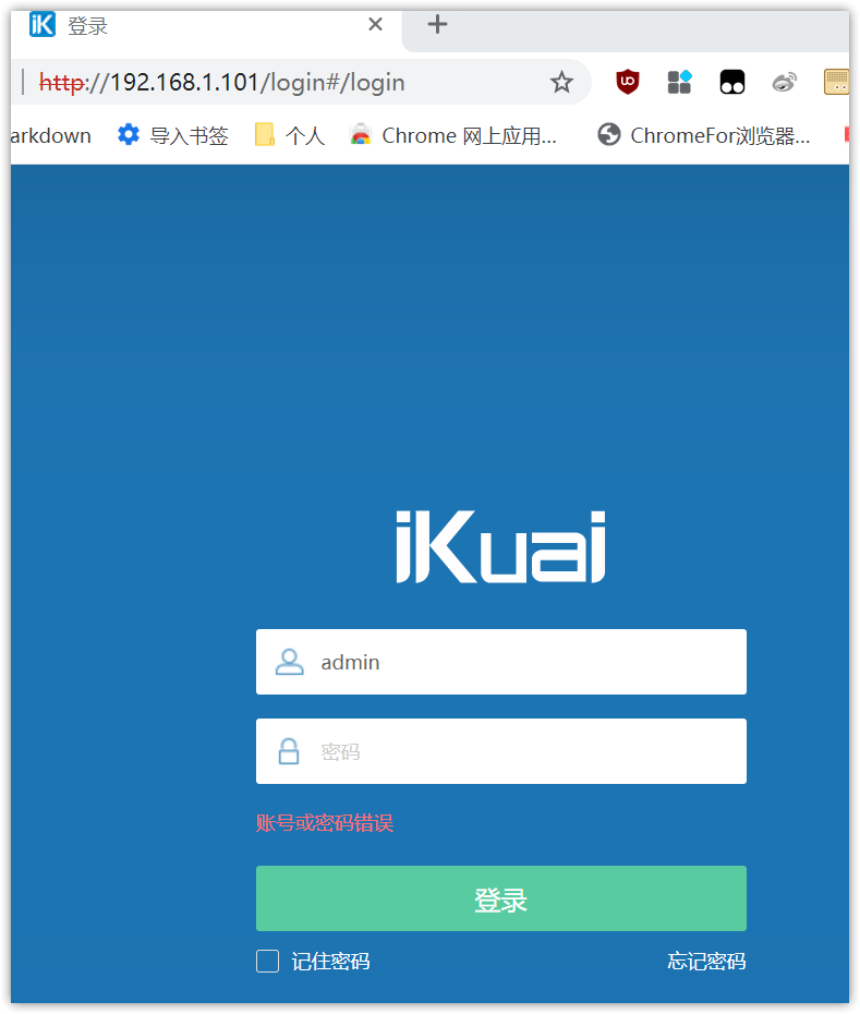 ▼在新地址栏输入iKuai的IP就会进入登录界面,初始账号密码都是“admin”