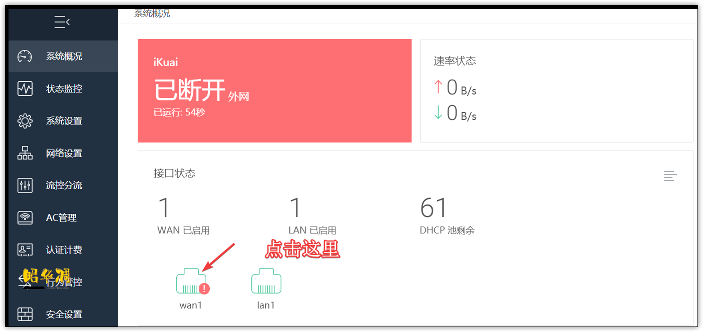 ▼进入iKuai主界面可以看到此时无法联网,先配置WAN/LAN口。