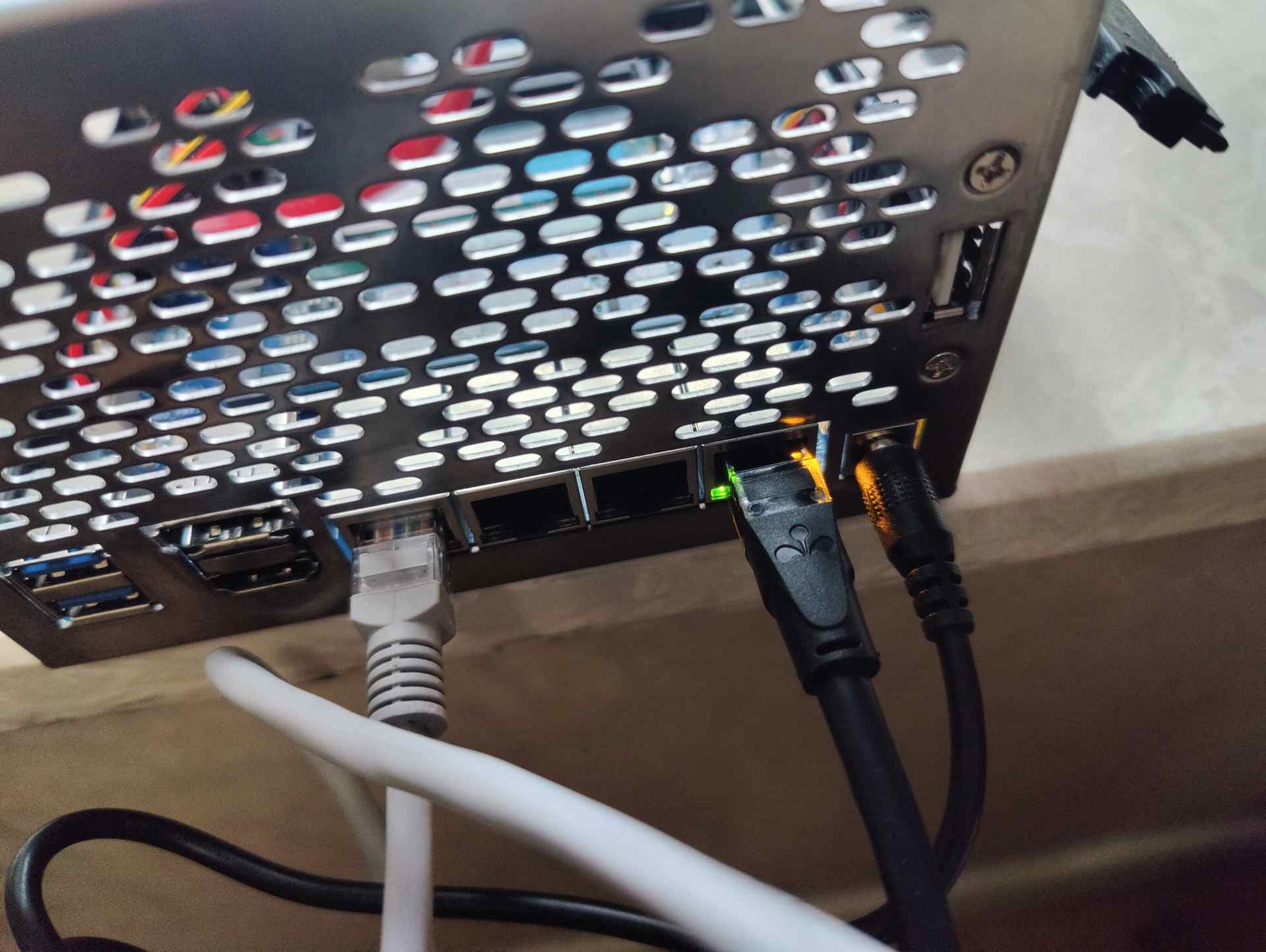 ▼最后将可以正常上网的网线连接靠近电源接口的网口,长按旁边的电源按钮重启。