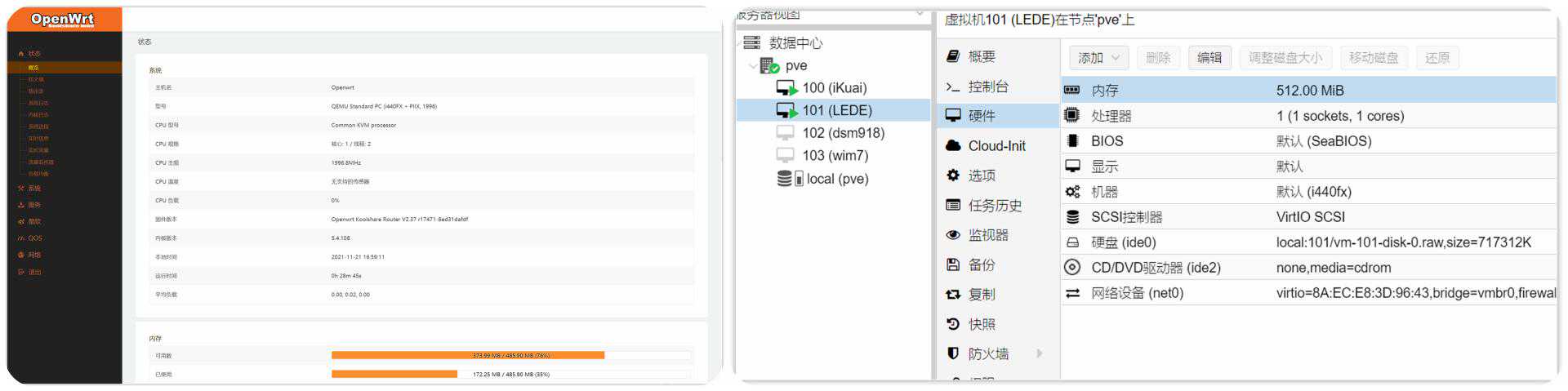 ▼进入LEDE可以看到当前分配CPU为1核,内存也只分配了512M,这个可以自行到PVE后台调整,调整结束后在虚拟机里面重启一下就行。