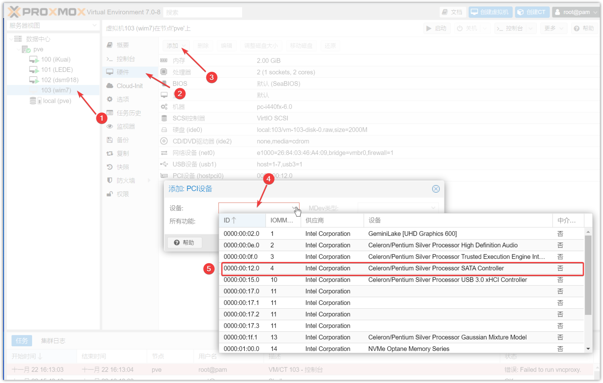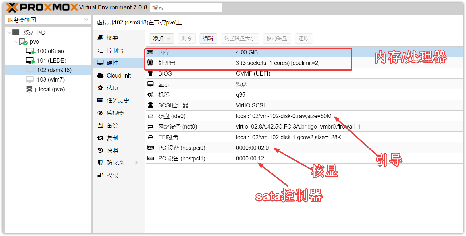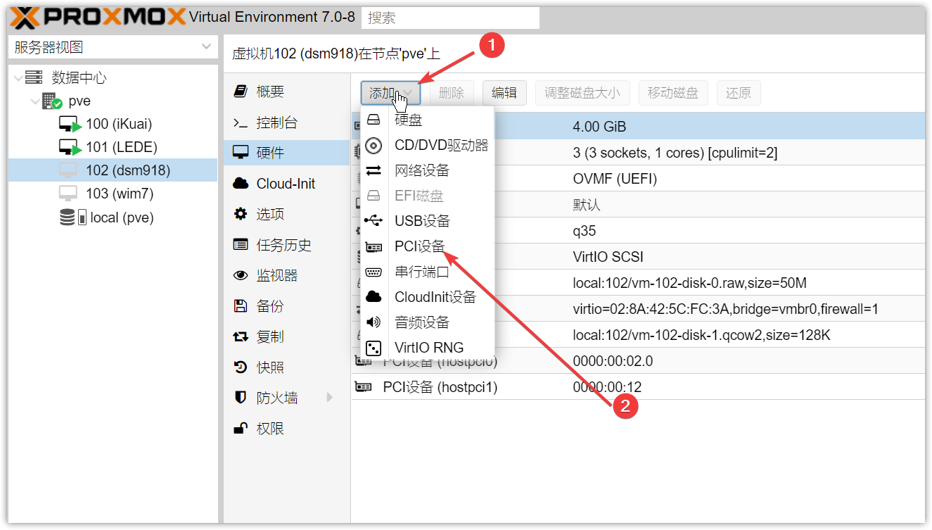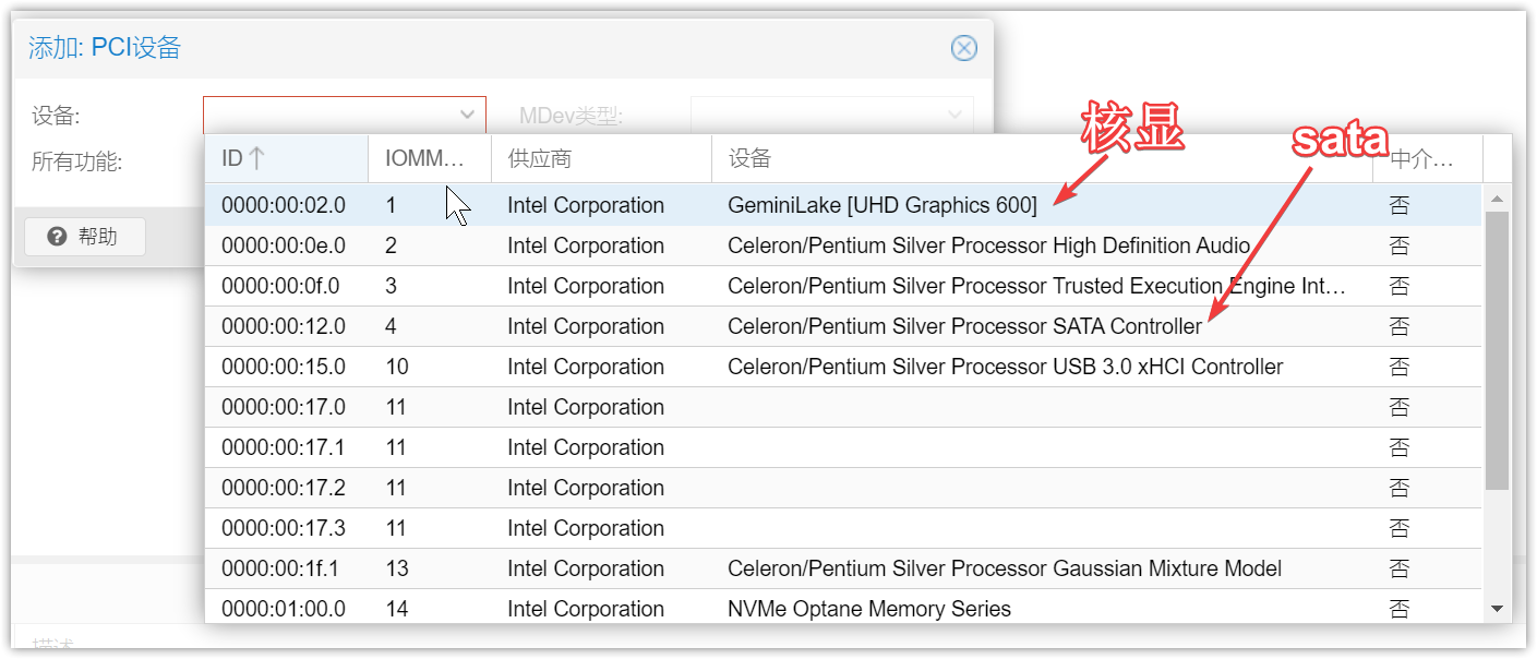 ▼核显、SATA的直通都是到手就配置好了的,如果你想手动添加可以选择【添加】-【PCI设备】,然后在设备栏选择。
