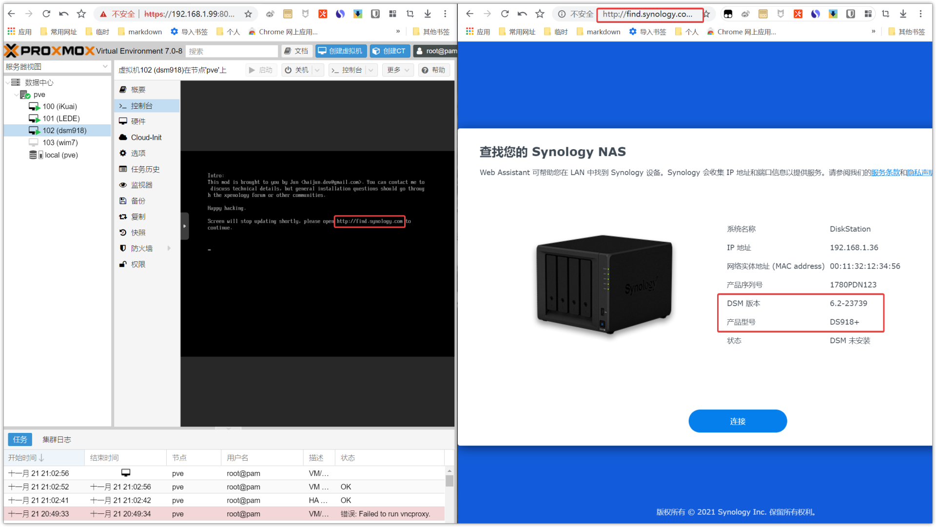 ▼运行群晖助手就能发现群晖,不想装助手可以像我一样,直接在新的页面输入网址(红框处)也能找到连接向导,记住DSM版本为6.2-23739