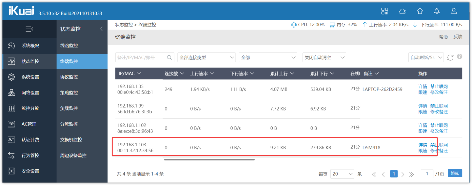 ▼主路由是爱快,所以我们要进入爱快,在终端这里查看群晖的地址,然后在地址栏这里输入IP就能进入群晖。