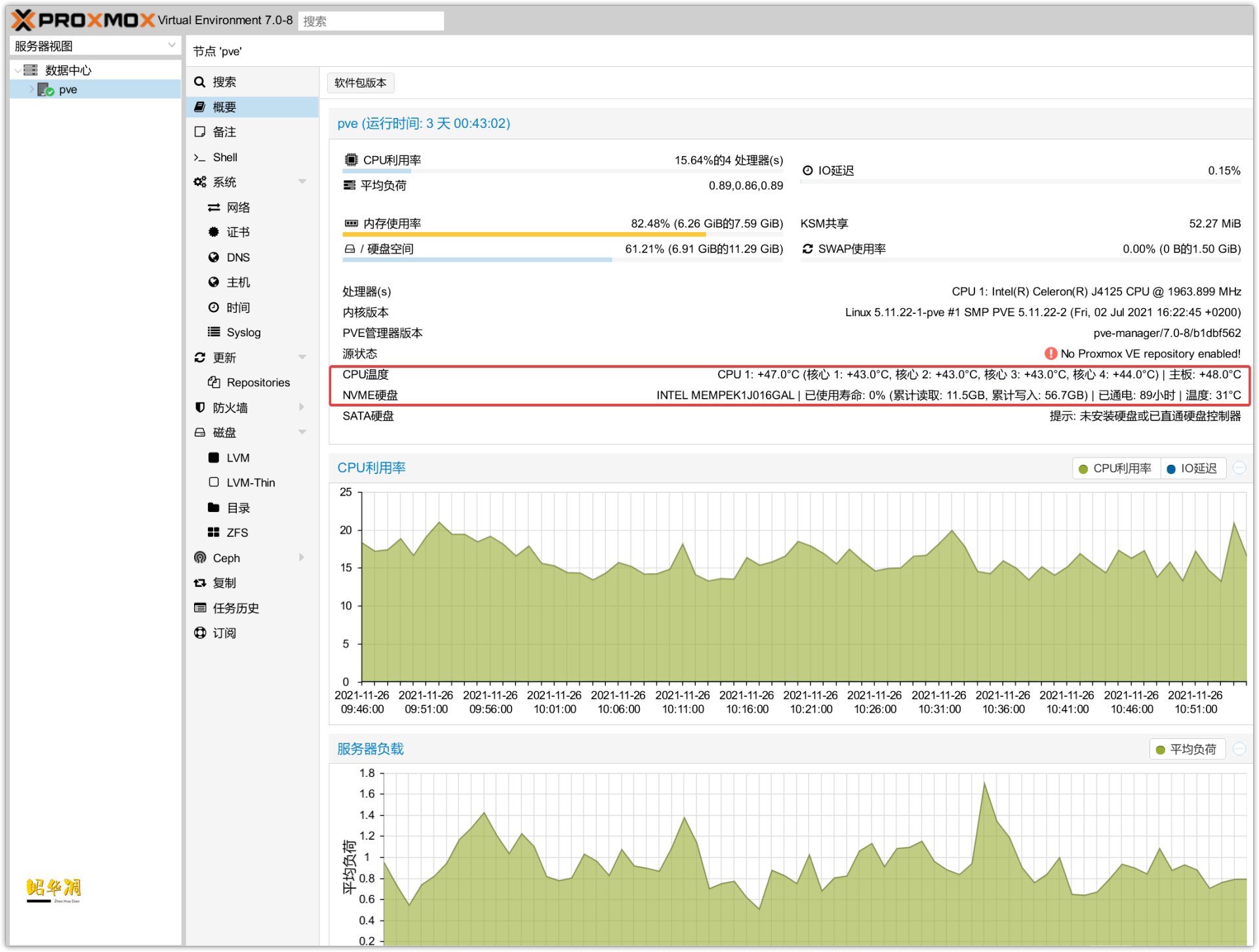 ▼不间断运行3天,查看PVE,主板和CPU温度不到50°+,NVME硬盘31°。硬盘做了直通给群晖,所以这里看不到。