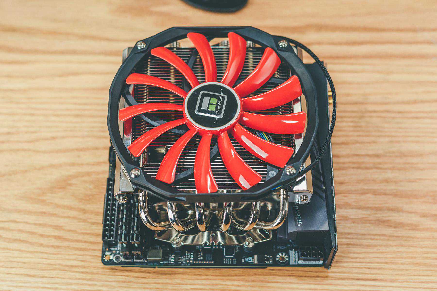 AXP-200R可以四个方向安装,但是最佳散热方向还是固定的,这里也可以看到作为一台14cm风扇的散热器,itx主板基本都被覆盖满了,而且必须先安装内存和,装机后才可以入主机箱。