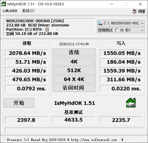 IsMyHdok中测试成绩达到了官方写入水平,连续读取速度为2078每秒,写入速度为1500MB每秒。