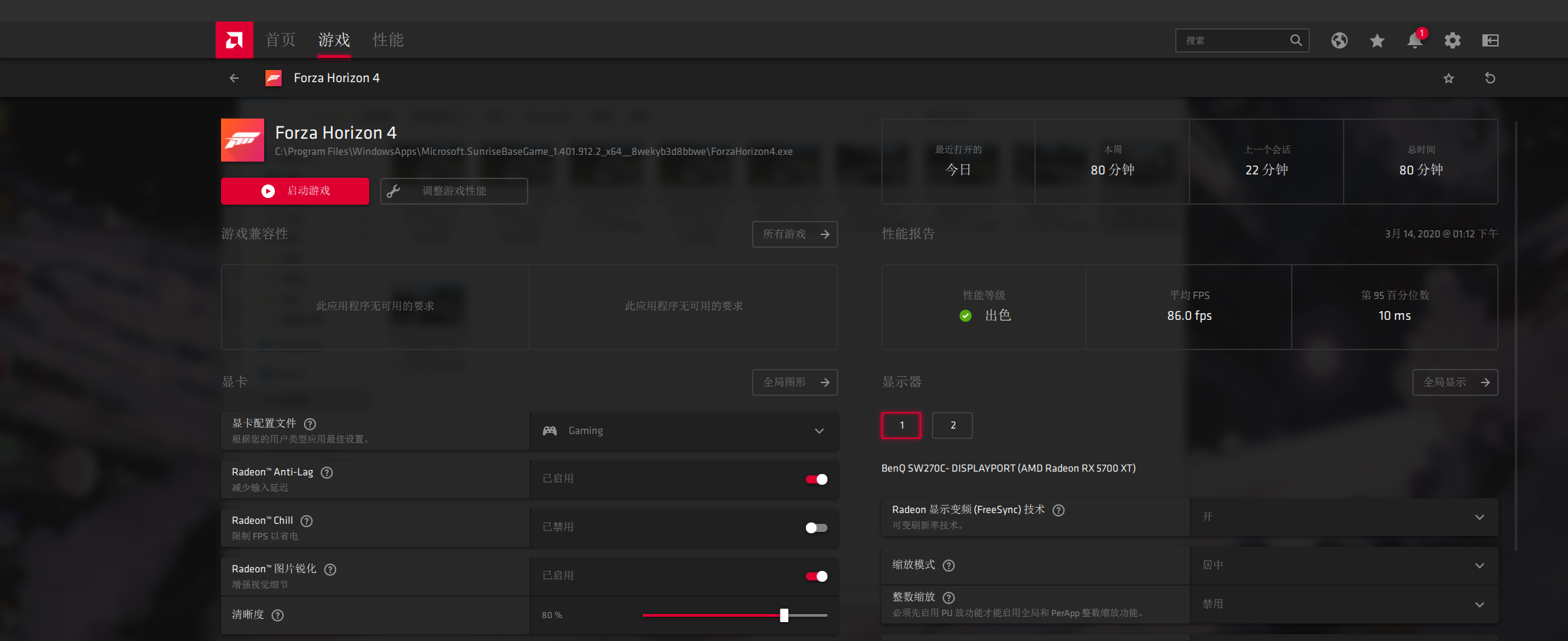 极限竞速地平线4在最高画质下(所有特效全开),2k分辨率,可以跑到平均86帧的优秀成绩。