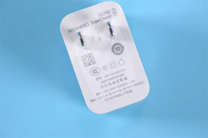 这是为华为nova6SE默认配送的超级快充充电器,与自家旗舰同款,外部采用阻燃PC+ABS外壳,白色外观,并配国标两孔插脚。具体参数为:HUAWEISuperChargeMax40W,型号HW-100400C00;输入100-240V50/60;输出5V/2A、9V/2A、10V/4AMax,体积不大、功率却十分高。