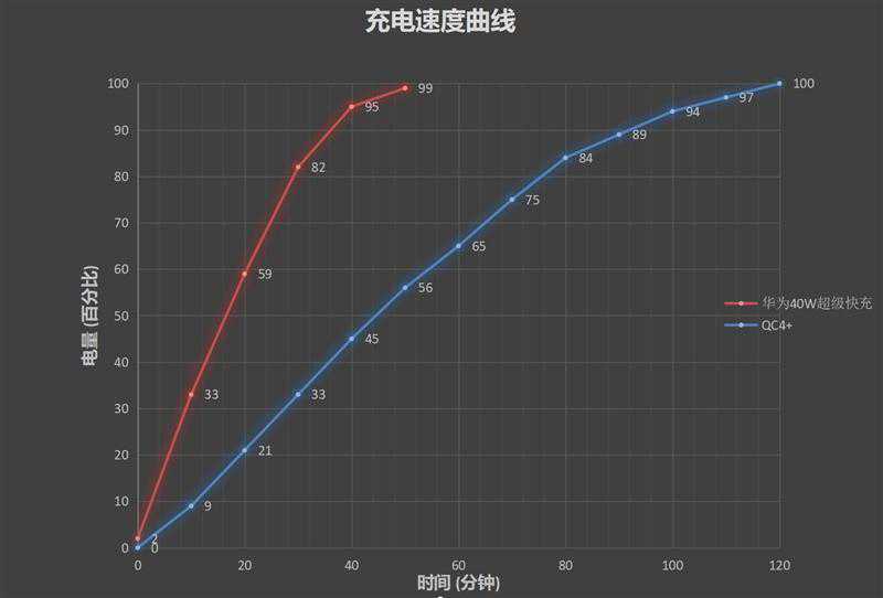我们以支持QC4+的某4500毫安时电池机型关机充电对比开机充电的华为nova6SE,可以比较直观地了解18W高压快充与40W低压大电流方案之间的区别,可以看出就充电时间而言两者绝不是由最高功率数值入手计算的2.2倍之差,至少要达到2.4倍。