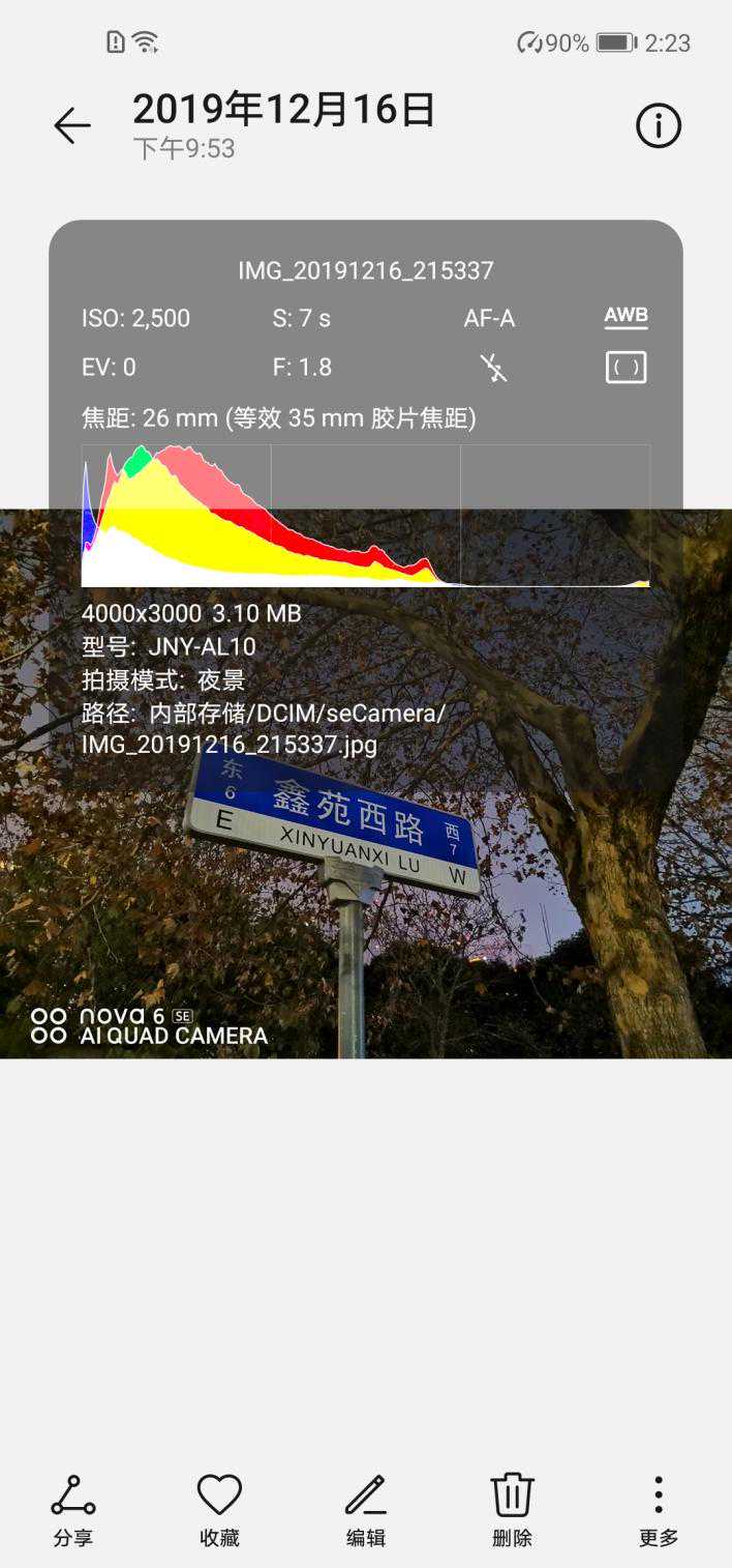 如上图所示,笔者没有借助任何工具辅助,手持时间达7秒却仍没有出现糊片。原因在于手持超级夜景算法会将连续的长曝光切分成数十个较短的中等曝光,每一个曝光既满足成像的要求,又避免了模糊。这些离散的图像,有的曝光相同,有的曝光不同,短曝光保证了高光不过曝,而长曝光恢复暗部细节。这也是华为nova6SE的超级夜景功能区别于其它品牌手机的一大特别之处,虽不足以撼动自家感光度更夸张的RYYB主摄旗舰,但是在2000元档还没有对手。
