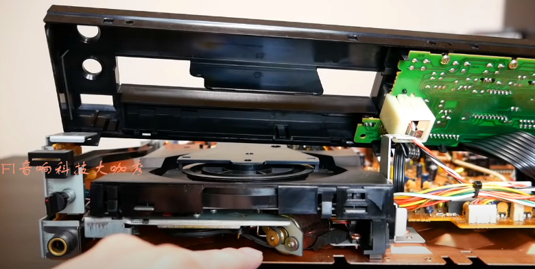 然后拆掉底部和侧面的螺丝,前面板就可以翻转上来了。通过仔细观察发现,这台机器的托盘电机在机架的下面,不拆掉前面板还不容易发现。在通电的情况下,可以看到皮带打滑,没有带动传动齿轮。