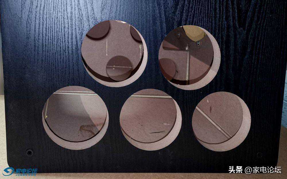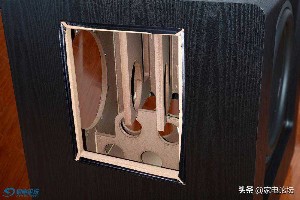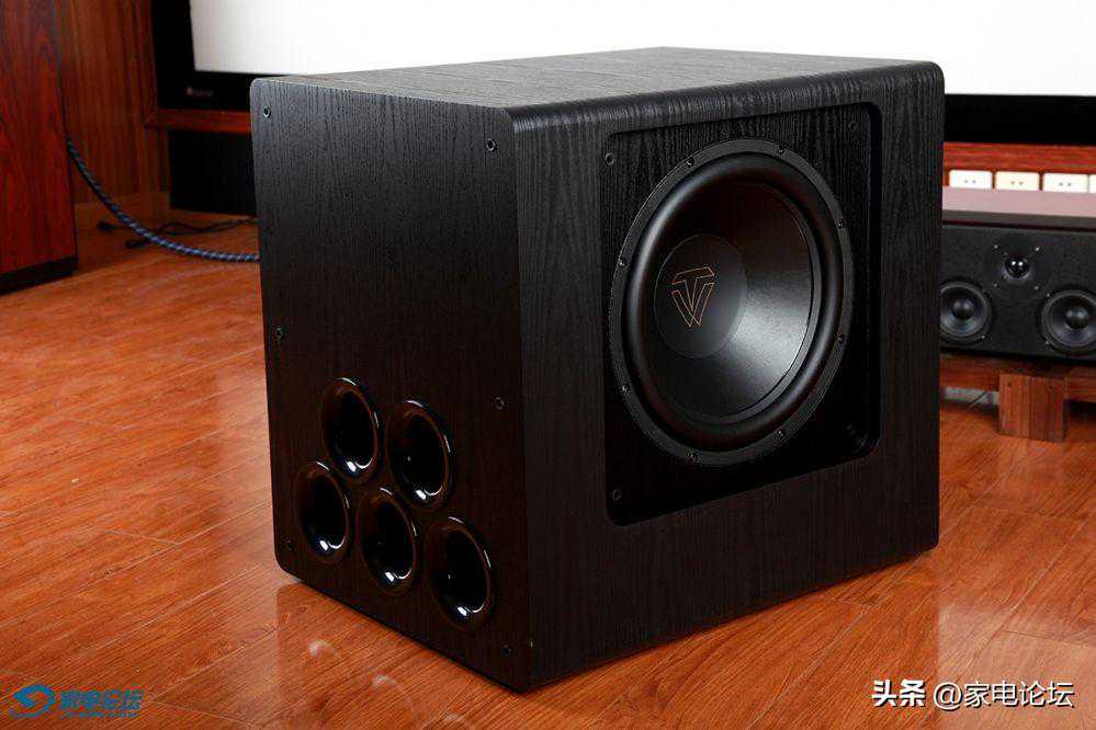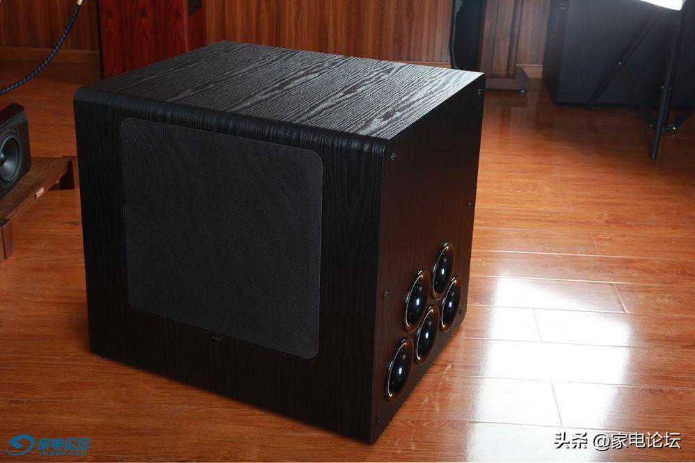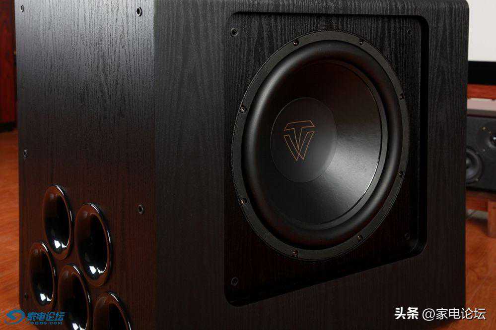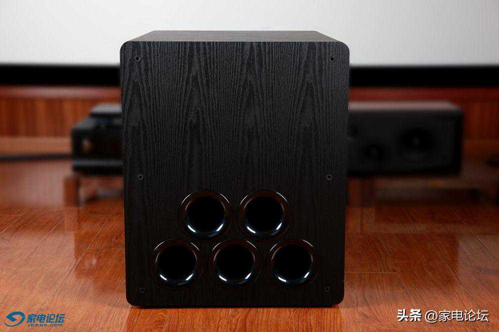 SUB-8000的两只15寸巨型低音喇叭分别安装在音箱的左右侧板之上,照片上只能看到一边,而箱体正面为5只圆形的管状前倒相式设计,前倒相设计比后倒向设计更有利于音箱的摆放,(后倒相设计的缺点是它需要离墙一定距离,根据低频下潜的不同有所差异,一般要求距离至少20厘米远甚至更多。因为后倒相设计的低音炮如果摆放太靠墙,会带来后倒相低频反射过强的问题,使得低频的听感浑浊、低频的质感模糊。)前倒相设计就基本不会受到离墙摆放太近容易让低频变得浑浊的毛病。这样就使得低音炮的摆位空间比较随意,特别是作为家庭影院,低音炮放在墙角,即使是靠墙摆放也不会影响低频效果。而5管的前倒相孔所叠加的出气量对于加强低频的量感更有非常明显的优势,低音炮发声时用手去接近这些倒相孔时,会明显的感受到低频气流从这些倒相孔中喷涌而出,非常擂手,那就是低频量感明显增加的佐证。毕竟低频是直接从这些倒相管直接射入你耳朵里的,听感确切!而大口径三圆管的倒相孔正是为加强低音炮正面的低频喷射能力,让低频声压更加的凝聚、浓郁和充沛。