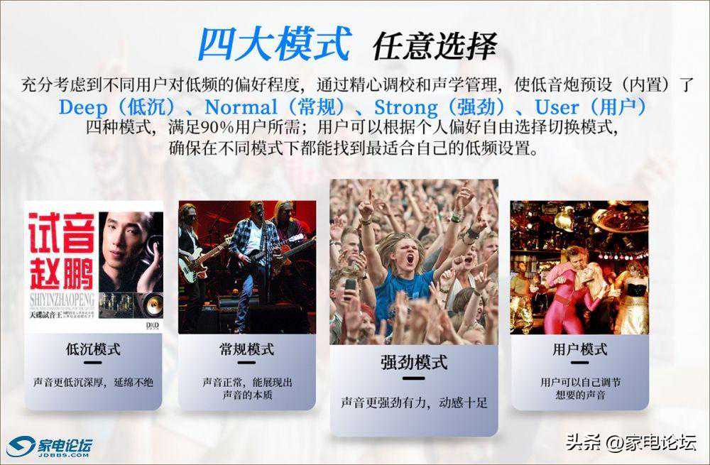 考虑到不同的用家对低频的偏好不同,厂家工程师通过消音室和高精度的声学测试仪器、结合自己资深的调声经验,在低音炮操作上预置了Deep(低沉)、Normal(常规)、Strong(有力)、User(用户自设)等四种声音效果,以满足绝大多数用家轻轻一按就能获得满意的低音效果,而对于要求较高的内行朋友而言,也可以同过“用户自定”模式,结合各种参数调节调整出自己更加满意的低音效果,操作既可以在手机APP上进行,也可以直接在箱体背板上通过按键和显示屏直接上手调整。