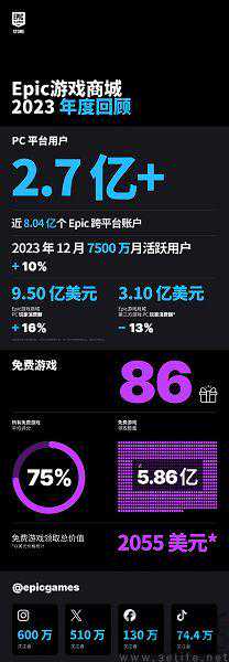 根据EpicGames不久前发布的Epic游戏商城2023年年度回顾显示,过去一年,Epic游戏商城比2022年增加了4000万用户,目前其PC端用户数量超过2.7亿,总体账户数达到8.04亿,同比增长11%。但在这一年里,玩家在第三方游戏上的花费为3.1亿美元、同比下降13%。所以Epic游戏商城的存在导致EpicGames收入和盈利能力都出现了下滑,已经是不争的事实。