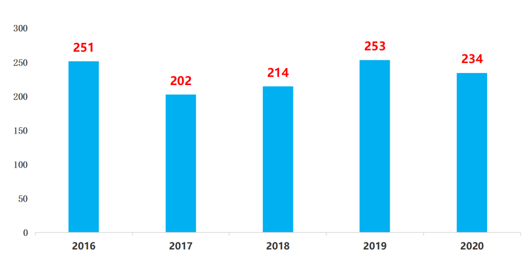 Biochimie近五年发文量比较稳定,均在200多篇,2016年发文量相对较多,超过250篇;2017年缩减50篇左右,2018年也只扩十来篇,2019年回归250多篇,2020年发文稍微缩减一些,发文量算是比较少的。