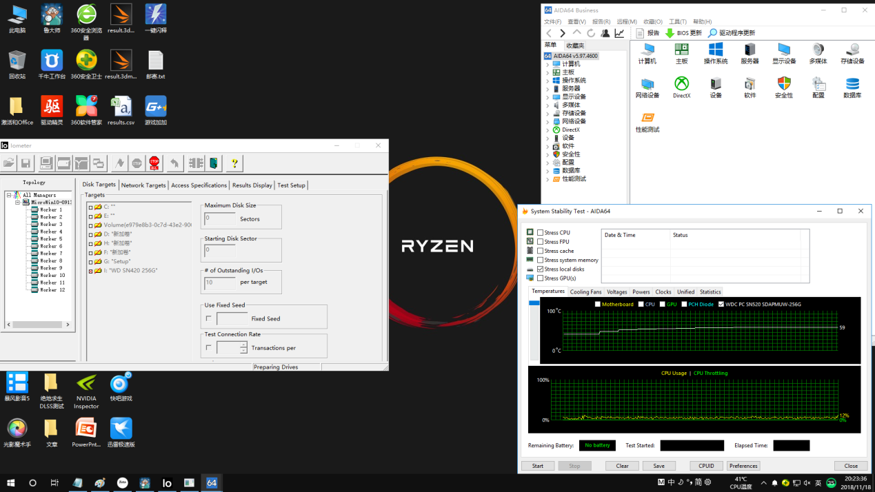 最后我们使用AIDA64的系统压力测试界面来监测这块SSD在满载情况下的温度变化。要让SSD满载不是说只读/只写就行,而是让SSD模拟多用户同时进行满载混合读写时的状态,这对SSD无疑是个巨大的折磨。这里我们使用iometer这款专门用于测试数据中心级SSD的软件对SN520进行测试。