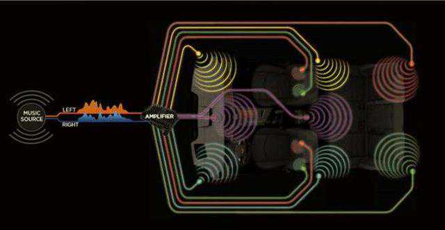 大家对这套音响系统的第一印象,也许就是扬声器的数量,比常见的豪华汽车音响翻倍还多,Bose采用一组较小的扬声器,取代原先尺寸较大的单个扬声器,既可以灵活地布置在更优化的位置上,又可达成单一扬声器难以做到的效果。