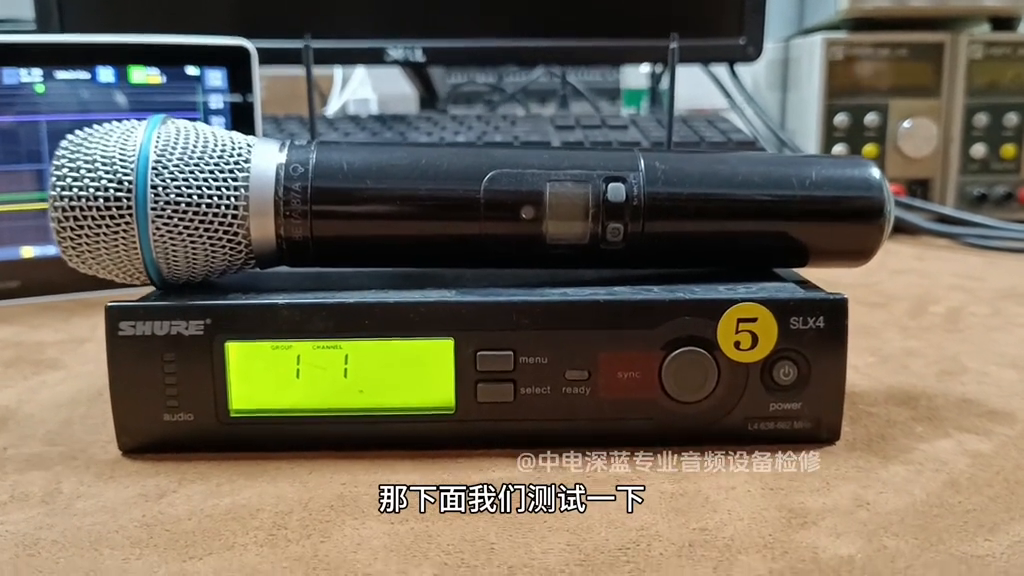 打开手持,接收机这边信号已经出来,ready小灯已经点亮,而且非常稳定。下面测试一下声音,这是舒尔SLX2手持测试,这套是我的无线话筒,已经完美修复。测试就到这里了。