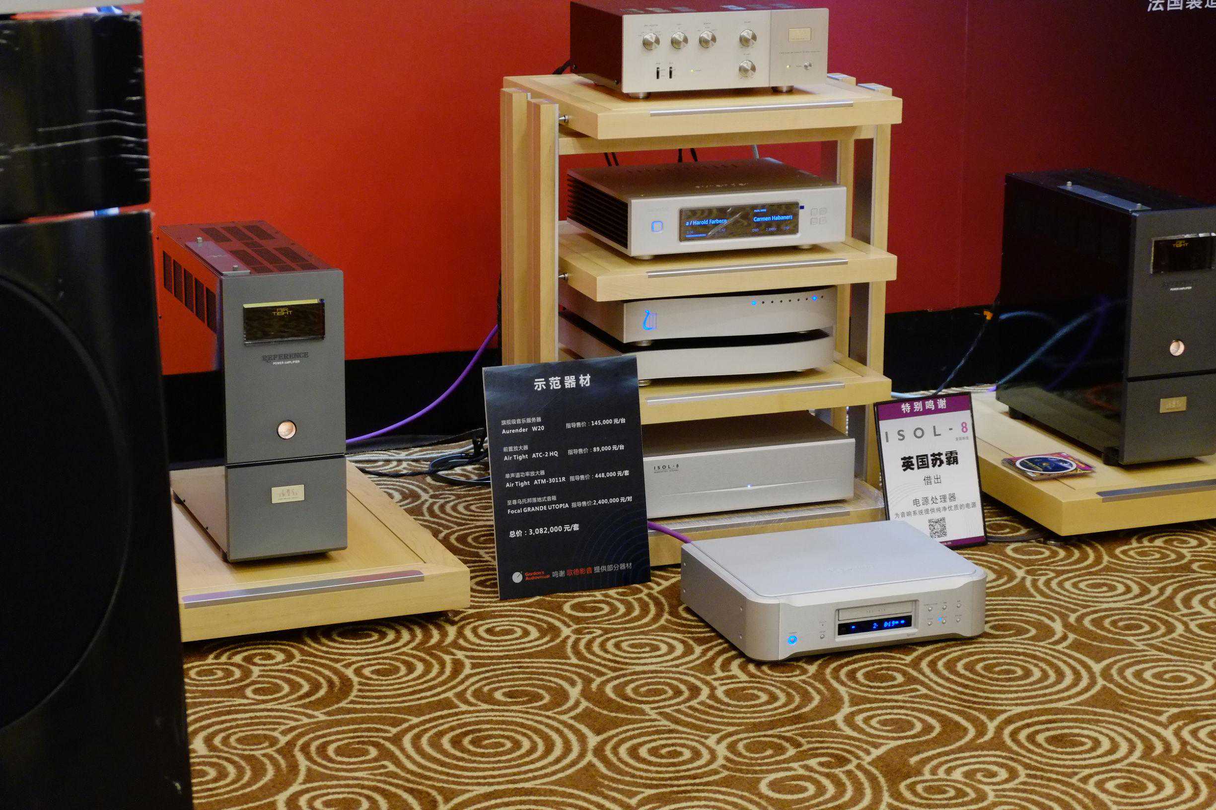 连陞公司展出总值超过300万人民币的顶级Hi-系统,成为展会焦点。以Focal旗舰产品至尊乌托邦GRANDEUtopiaIII为核心,搭配本次展会中大热的顶级数字音乐播放器AurerW20,放大部分由AirTight的ATC-2HQ前级搭配ATM300Anniversary(30年纪念版300B单端后级)组成,每天都吸引不少发烧友和拥趸捧场。