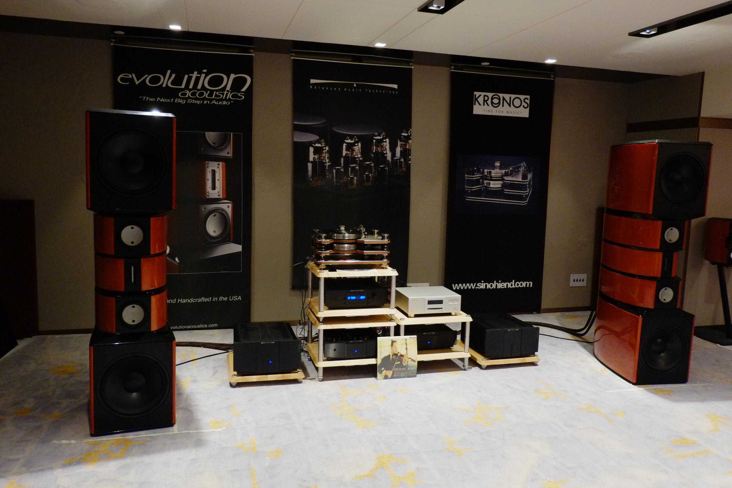 上海立敏音响主系统:加拿大Kronos全新顶级LP黑胶唱盘Sparta,搭配BalancedAudioTechonology(BAT)旗舰放大西装驱动EvolutionAcousticsMM7分体旗舰落地扬声器,实力惊人,成为展会中最受认可的几套顶级系统之一。