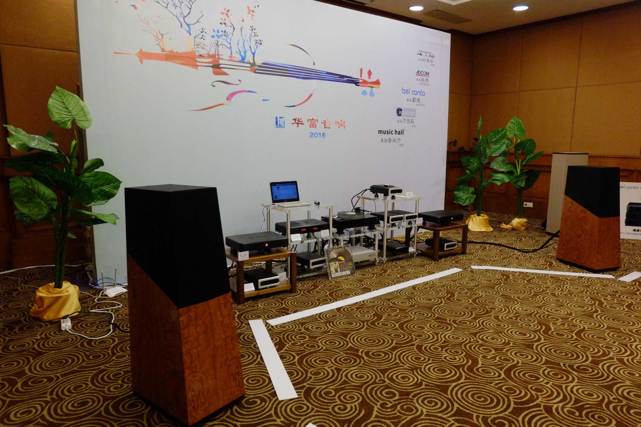 华富音响展房中以MusicHall音乐厅、Bel-Canto霸道搭配万登庭VandersteenModel5ACarbon顶级音箱。万登庭Vandersteen,霸道BelCanto,爱琴Adcom,音乐厅MusicHall等品牌的多款型号也有展出。