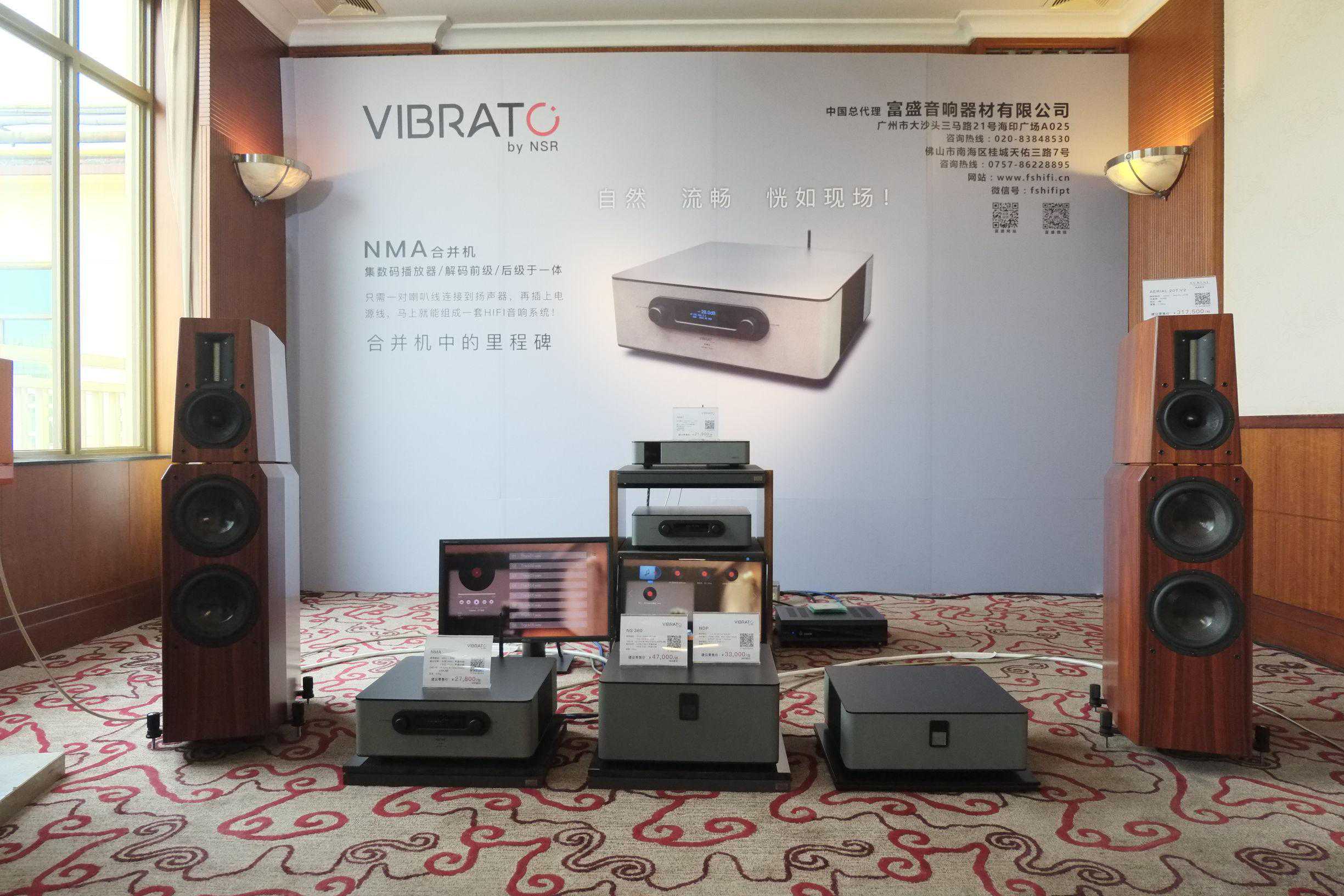 富盛其中一个展房以自家品牌VIBRATO为主角,新推集DSD解码、数字音乐播放及功放于一身的旗舰一体机NMA,NDP解码前级、NS380后级以及主打性价比的书架箱SWING。当然还有VIBRATO的开山之作MODELONE。