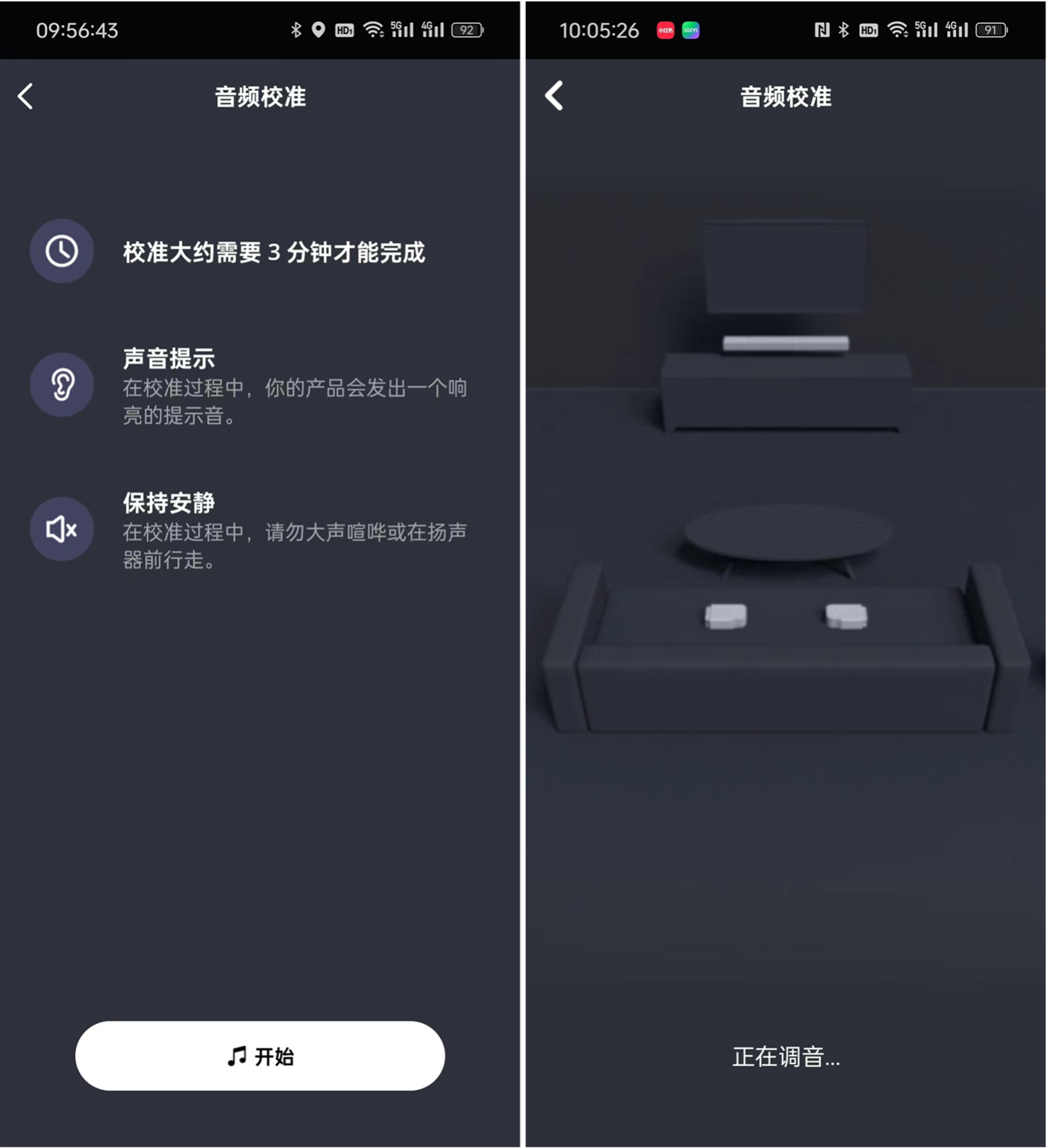 当然,一款产品到底好不好用,还是通过实际上手给大家详细分享吧。说实话,虽然看上去产品配件很多,但时间组装起来还是蛮简单的。接线完成后开机就可以使用。第一次使用时建议用产品APP进行声音校准(不支持APP调节),这样就可以根据所在环境自动设置好环绕音效了。
