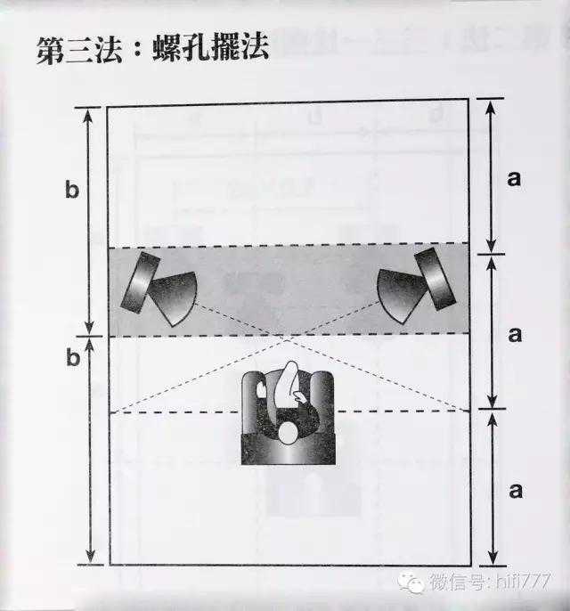 此法专治高音太尖锐、中音太瘦、低音不够的缺点,面对许多恶劣的环境时可以取得最佳的效果。这是针对台湾普遍不良空间所提供的有效摆法,百试不爽。只要您用过「三一七比例法」跟「三三一比例法」,仍然无法找到正确的声音时,就可采用此法。