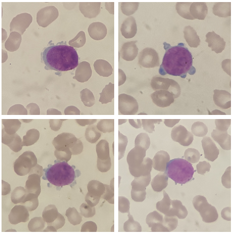 果不其然,发现原始细胞,比例高达55%,且有一部分原始细胞的胞浆有“伪足样”突起,当时我脑海中就浮现出会不会是M7?因为在天津血研所进修的时候老师就形象地比喻过M7典型的细胞形态像“小乌龟”一样,边缘有“乌龟爪”突起,难不成今天让我碰到了。