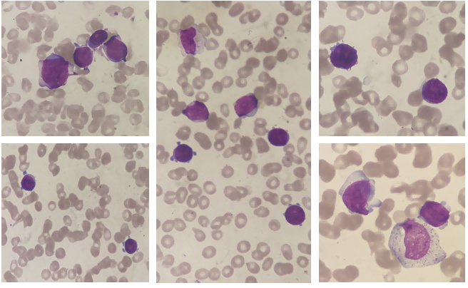 血常规:文献[1-2,5]共报道了35例患者,其中白细胞增多的有17例,正常的有9例,减少的有9例。26例患者中(有9例未报道),血小板减少的有20例,正常的有4例,增多的有2例。35例患者外周血均发现原始细胞,比例在2%-84%之间,提示我们可以通过外周血涂片初步筛查急性白血病。