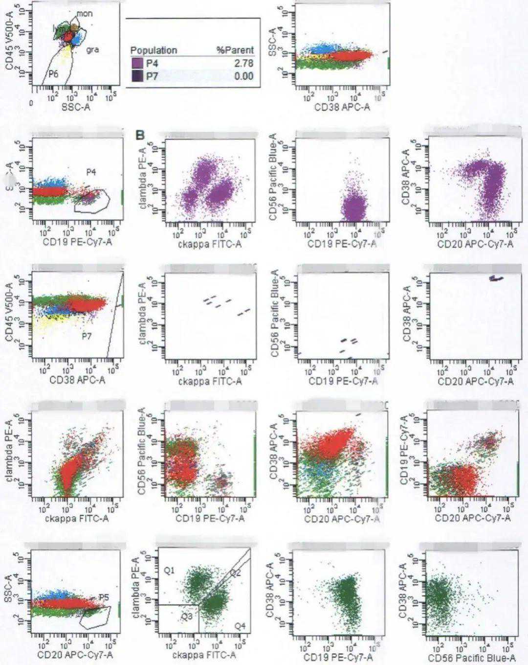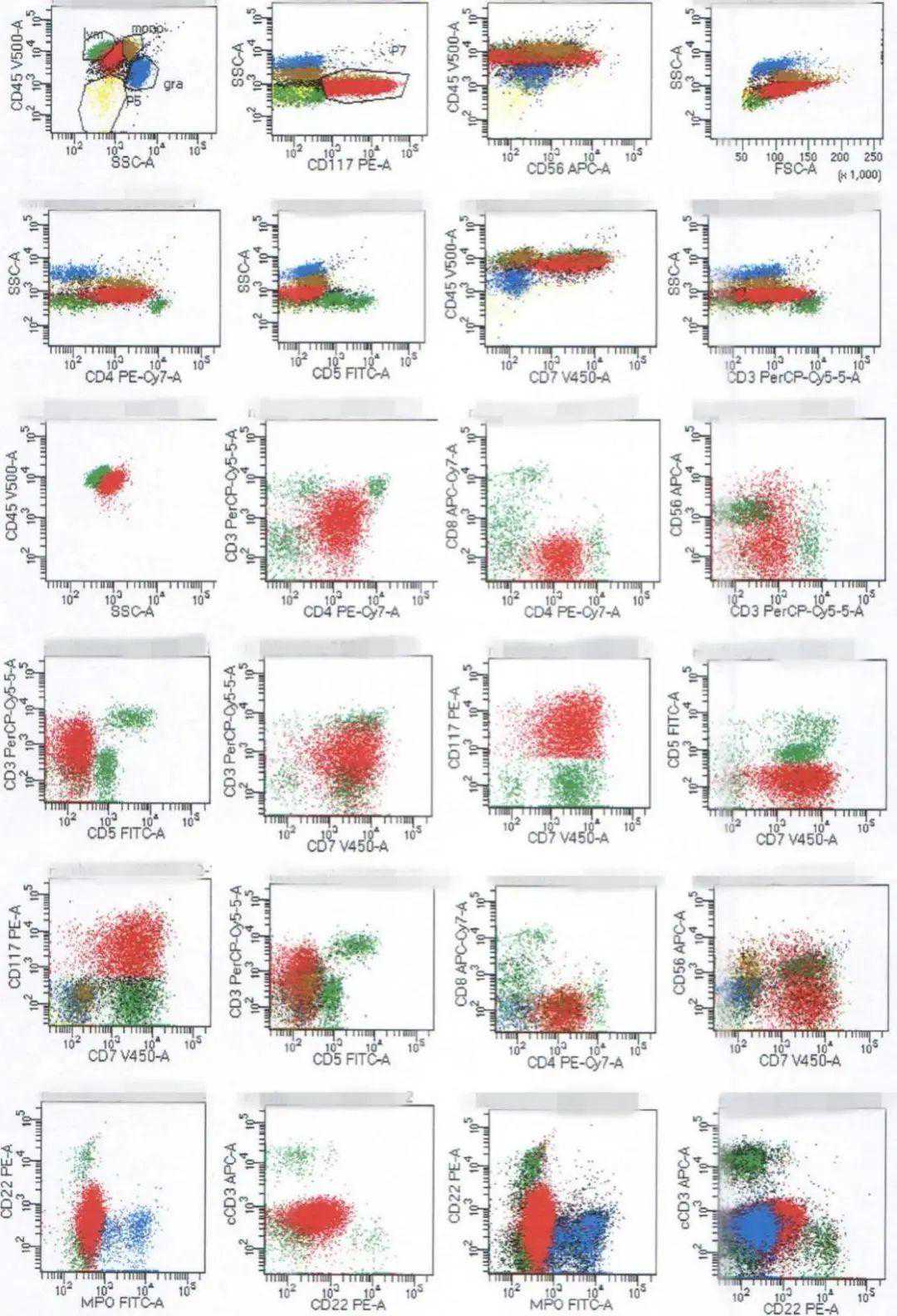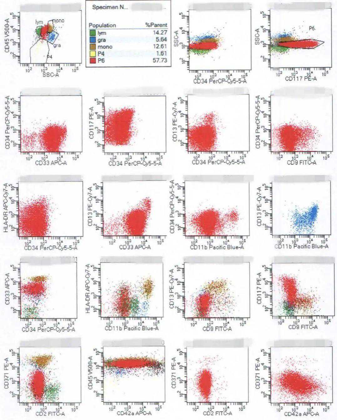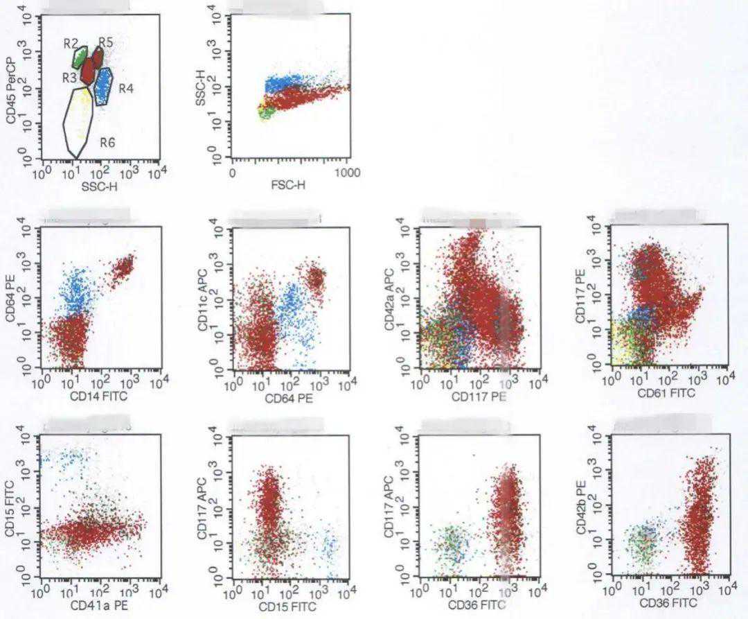 流式免疫表型[2,4,6]:37例患者均表达CD41、CD42,部分患者还表达CD13、CD33,跨系抗原表达率相对较高的为CD4、CD7、CD56。不过需要注意的是由于血小板可以粘附在原始粒细胞或原始单核细胞表面,造成血小板表面标记假阳性结果,所以细胞质CD41、CD42、CD61标记,比细胞表面标记更可靠。