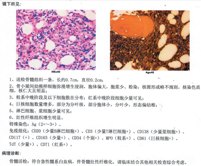 本病例虽然骨髓穿刺也为“干抽”,但原始细胞数量超过了急性白血病的诊断标准,且经流式细胞学检测部分原始细胞表达CD41a、CD41b、CD42a、CD61这些巨核细胞的标志,同时骨髓活检免疫组化也有CD61的表达。