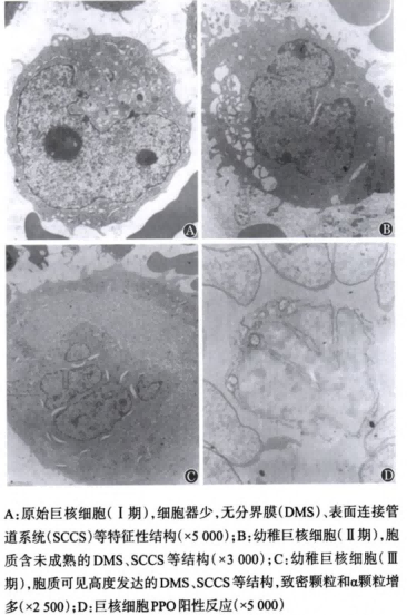 幼稚巨核细胞(II-III期):细胞体积大,表面有不规则突起或伪足,核极度不规则,呈多极、多叶形态,异染色质丰富,核仁明显,胞质量多,部分细胞含大量DMS、SCCS,以及致密颗粒和a颗粒。