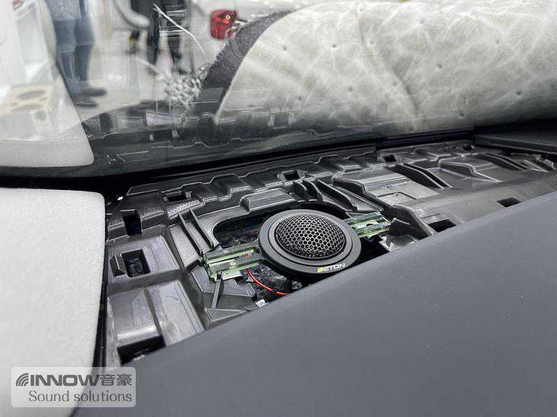 隔音完成后,技师将前声场喇叭升级为德国伊顿两分频套装喇叭,它采用了天然蚕丝膜球顶振膜的高音单元,高频表现泛音丰富,具有音质清晰、声色柔和细腻的特点;而中低音单元,则采用了先进的双层振膜技术打造的双层玻纤纸膜音盆,搭配顶级橡胶悬边,能够带来动感十足、结实有力的中低频表现,非常符合车主的听音喜好。