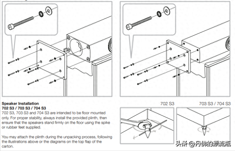 配件中的工具是比较齐全的。如内六角螺丝批以及扳手。工具主要用于安装音箱与底座。因为箱体设计的导向孔是朝下的,所以,箱体和底座之间还有一定的距离。脚钉方面配置了两套,分别对应木地板和瓷砖。
