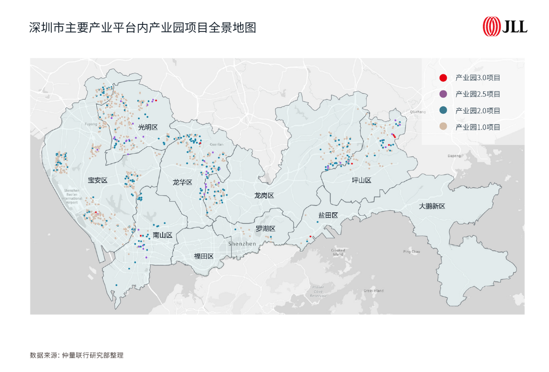 根据仲量联行统计数据,在总体量约8,600万平方米的深圳产业园存量产品中,硬件设施标准较低的项目数量达九成之多——其中产业园1.0项目占62%,产业园2.0项目占28%。而硬件标准和品质较高、配套设施更加完善的产业园2.5和3.0项目的占比仅分别为9%和1%。从点位分布来看,超过半数的2.5及3.0项目都分布在坪山和南山两区之内。长远来看,高品质项目拥有广阔的发展前景。