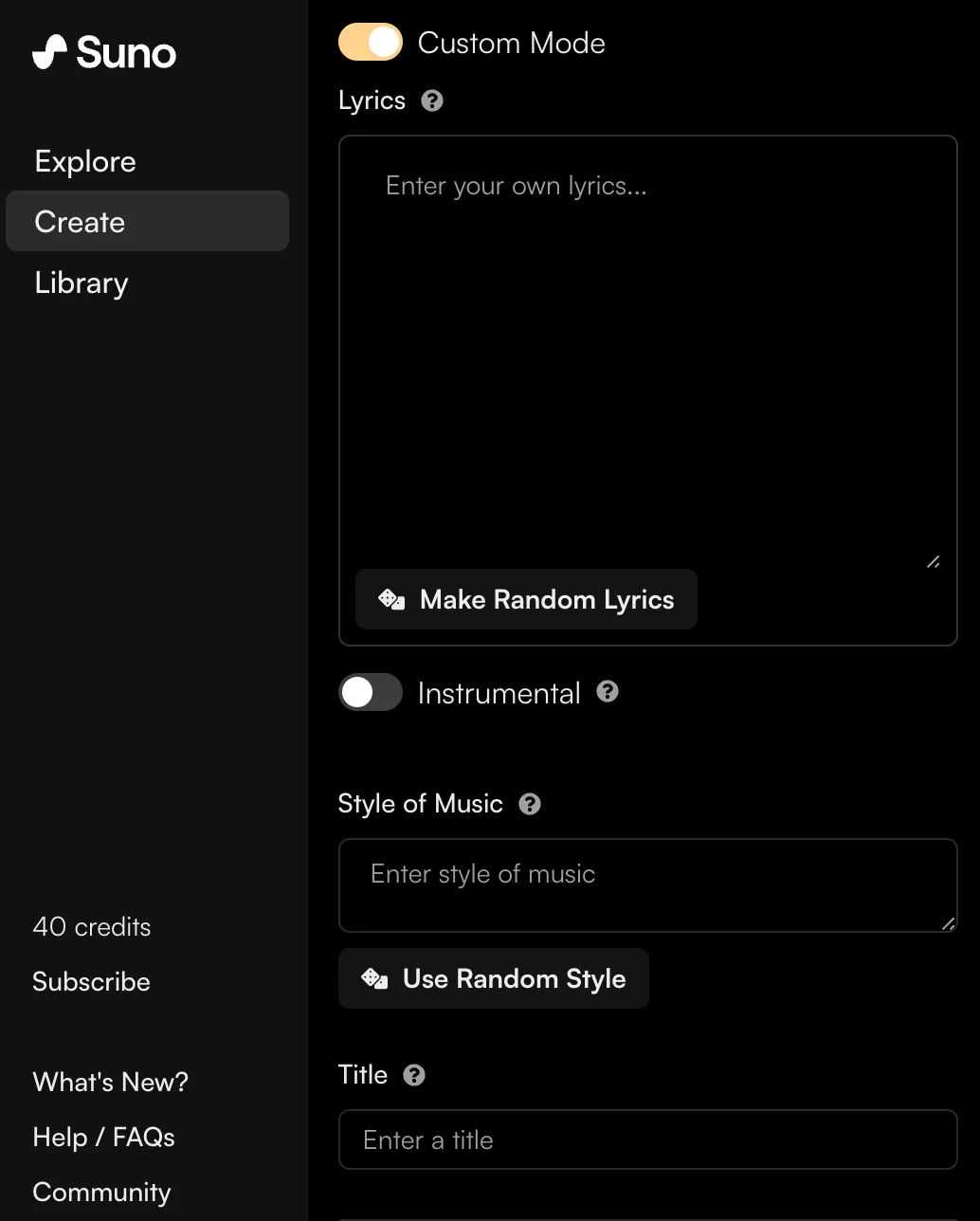 进入自定义模式,则可以完成更细致的操作,如自行输入歌词、歌名及更多的音乐风格,当然这些也可以由Suno随机生成。