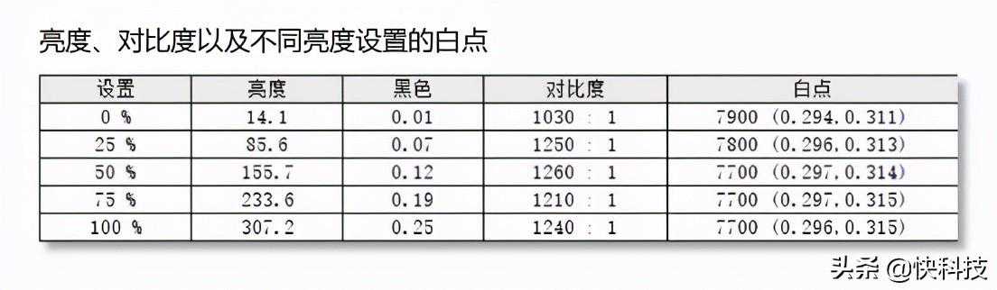 最大亮度为307nit,对比度为1240:1,色温7700。屏幕亮度略低,色温偏冷。