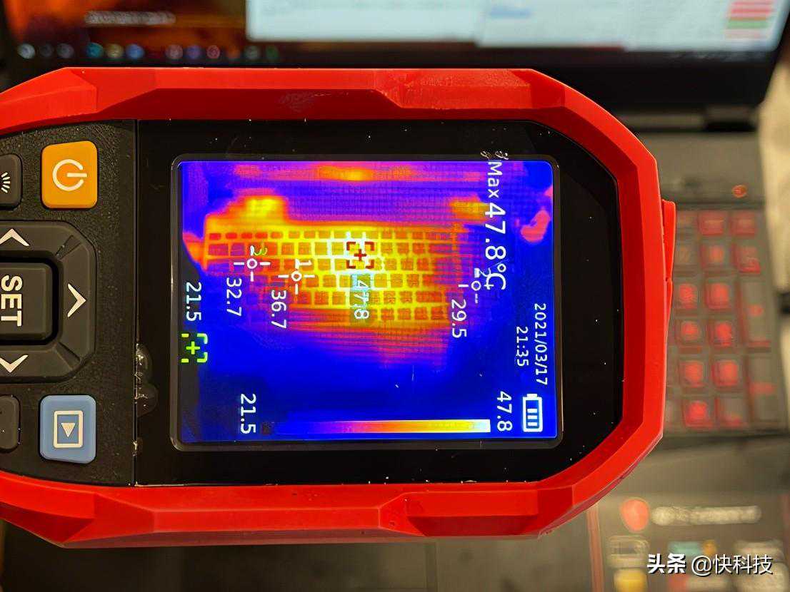 使用热像仪看看C面的发热情况。在双烤的极限负载下,键盘区正中位置是高温区,温度可以达到47.8℃,可以明显感知到烫手,但周围的WSAD区却显得异常凉爽,温度只有32.7℃,用手接触基本感觉不到发热。