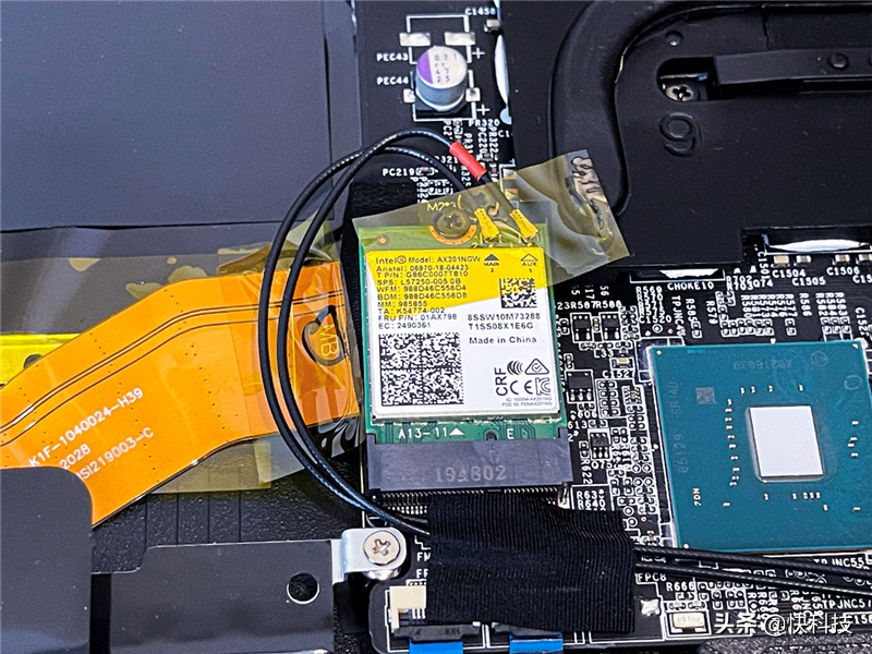 硬盘位旁是无线网卡插槽,冲锋坦克2GL65使用的是笔记本上常见的IntelAX201NGW无线网卡,其最高支持160MHz2×2MIMO连接,理论速度可以达到2.4Gbps。
