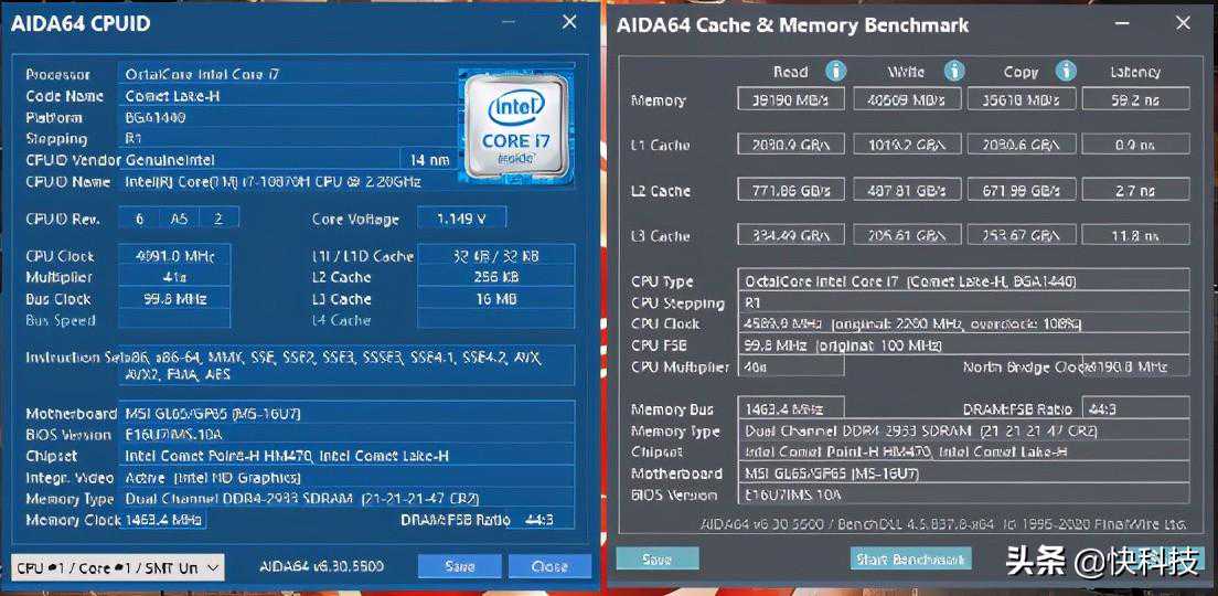 冲锋坦克2GL65搭载了2×8GBDDR43200MHz内存,不过实际只能在2933MHz运行。写入速度39190MB/s,写入速度40509MB/s,拷贝速度35618MB/s,延迟59.2ns。