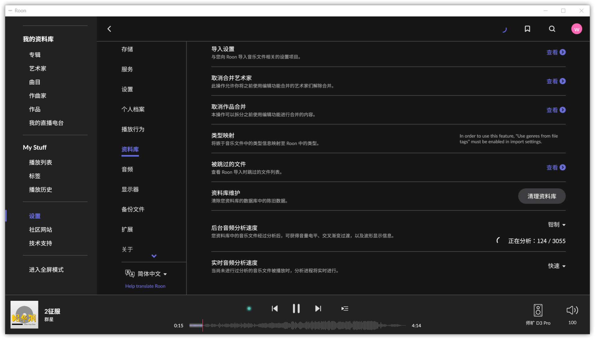 roon在扫描完音频文件后会自动将低音质音频采样率提升至44.1kHz(准CD格式),同时会与服务器进行对比,补充曲目相关资料并生成响应的资料库。