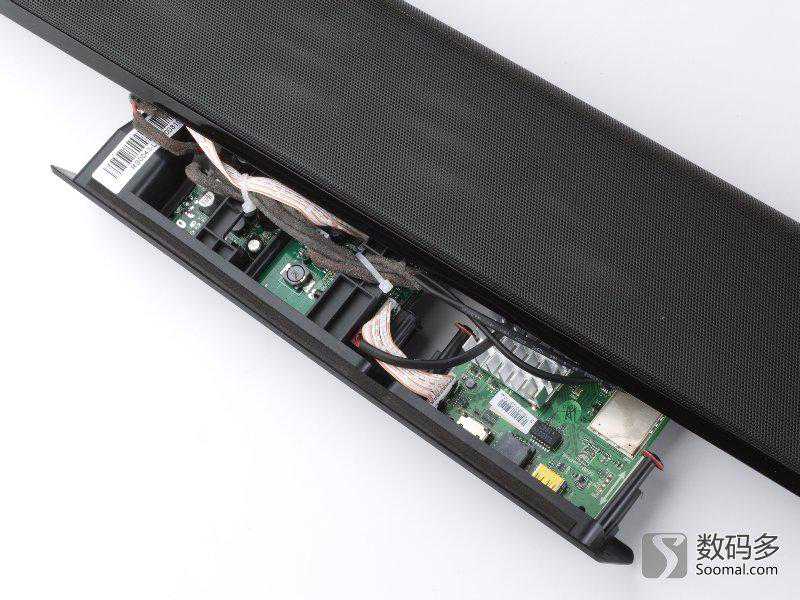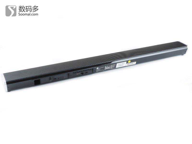 有趣的是,这款STV215在京东的JBL和创维经销商处都可以购买到,创维的售价要便宜100元,但肯定是完全一样的产品。STV215箱体剖面为向上倾斜的四边形造型,这也是由于现在电视柜高度普遍较低,这种设计有利于提高声音的结像点。我们并未对音箱进行彻底拆解,从官方资料来看,它采用了两个1.75英寸寸的高音和两个2.5英寸的重低音单元,阻抗4Ω,音箱整体功耗为30W。