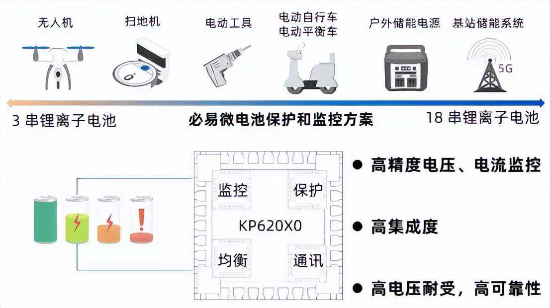 专注于提供完整电源解决方案和系统集成的深圳市必易微电子股份有限公司,紧跟市场步伐,推出了内置均衡功能并且保护齐全的多串电池监控芯片,分别为支持3-10串电池组的KP62010,以及支持3-18串电池组的KP62030。