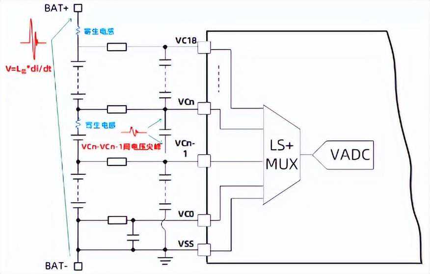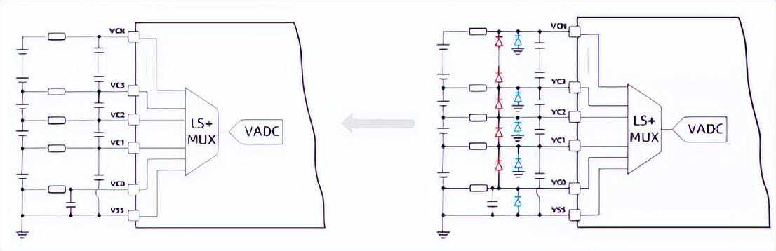 大多数的AFE的电芯连接线间VCn-VCn-1可以承受15V左右的正电压,然而对于负电压情况却只有-0.3V的承受能力。这是由于负压会使芯片内部二极管导通。在使用外部均衡的情况下,可以由外部较大的滤波电阻(通常为1kΩ)限制电流。而在内部均衡情况下,外部滤波电阻较小,负压会导致大的反向电流流过内部路径,从而产生芯片损坏的风险。