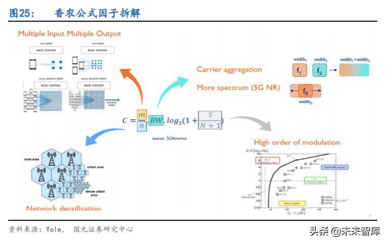 5G技术实现信息传送速率的进一步加快。提到信息传送速率,自然离不开香农定理:C=(M/N)*BW*log2(1+SINR)。其中,C为最大信息传送速率,BW为带宽,SINR为信噪比,M为传输和接收的天线数量,1/N为基站网络的密度。5G的核心技术就是通过增加基站密度、采用MIMO和载波聚合技术、提高带宽、高阶调制以提高频率效率来提高M/N、BW、SINR,进而提高最大信息传送速率。